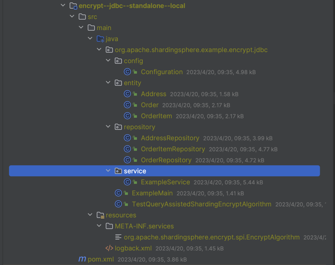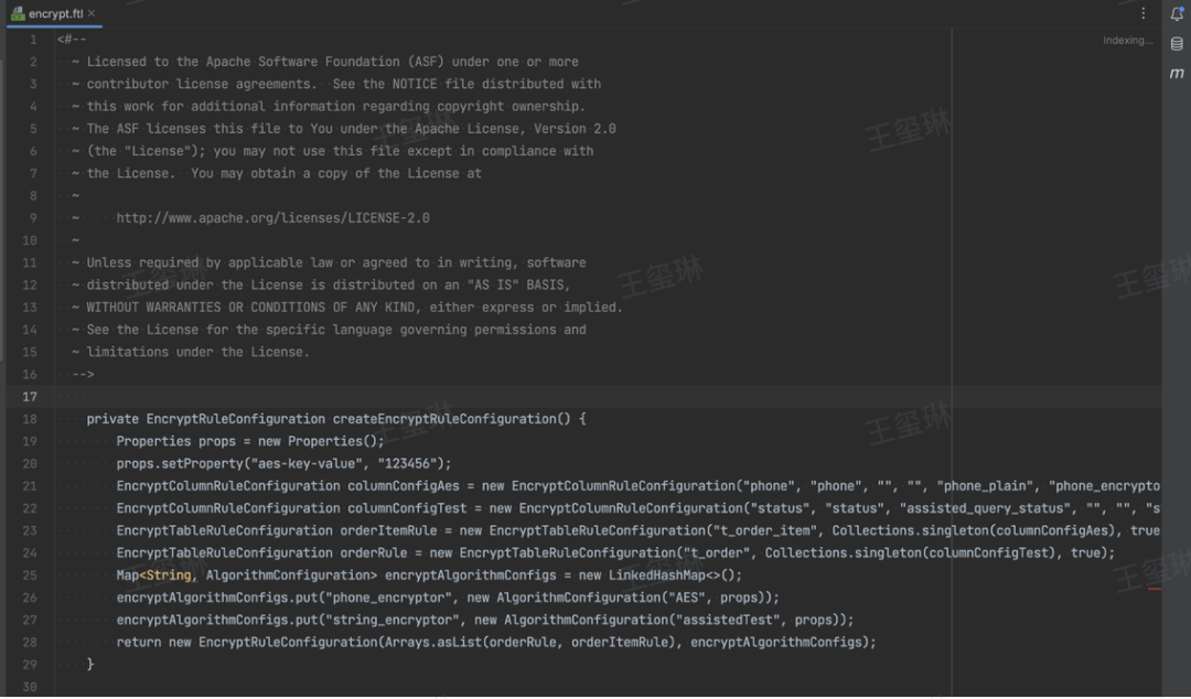 上述问题中,核心问题就是代码示例耦合太过严重,并且不够灵活,用户学习成本比较大,我们的目标就是用户可以自由组合选择他需要的 ShardingSphere 支持的模块和功能,并且可以有不同组合排列,通过分析调研,我们基于 freemarker 模版引擎,提前将 ShardingSphere 的模块拆解成最小组合单元,将这些组合单元分别预制在不同的场景下,用户选择场景组合时自动抽离出对应的逻辑单元进行排列组合,生成对应的示例工程。如图 2 所示为加密模块的最小逻辑单元。通过对功能代码的最小逻辑单元的拆分,我们可以基于用户的的选择,灵活地组合功能特性,达到按需取用的目的。同时,除了核心功能模块的代码逻辑的拆分,我们将原来公共业务逻辑的代码模版化,取消业务代码的抽象逻辑,降低用户的学习成本。如下图 3 所示:为了更加贴合 ShardingSphere 的特点以及目录层次,我们抽象出了几种类型的配置,例如从整体的产品使用角度我们分为 jdbc 和 proxy,功能特性上我们分为了加解密、读写分离、分库分表等等,支持的配置类型详情见表 1。