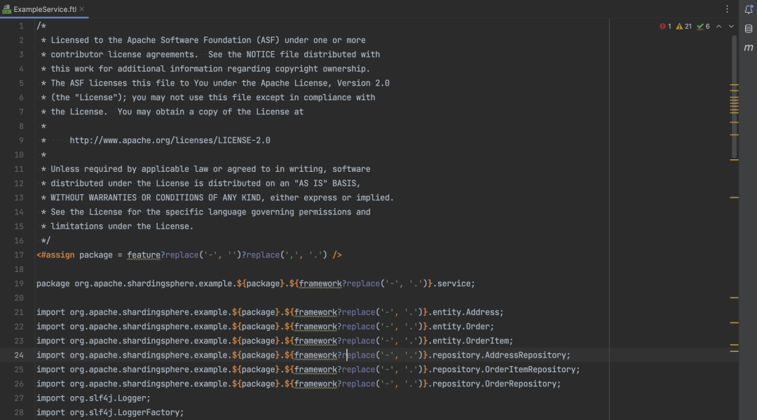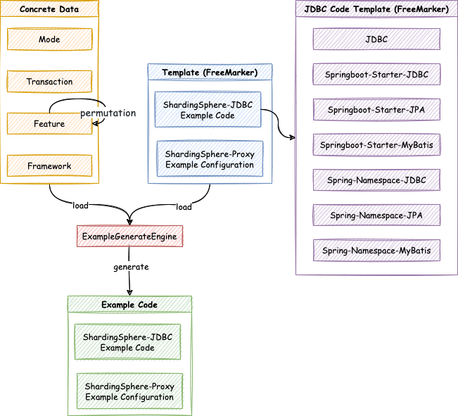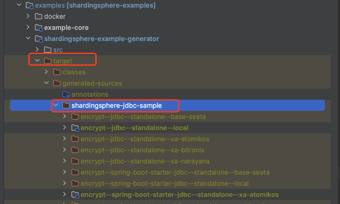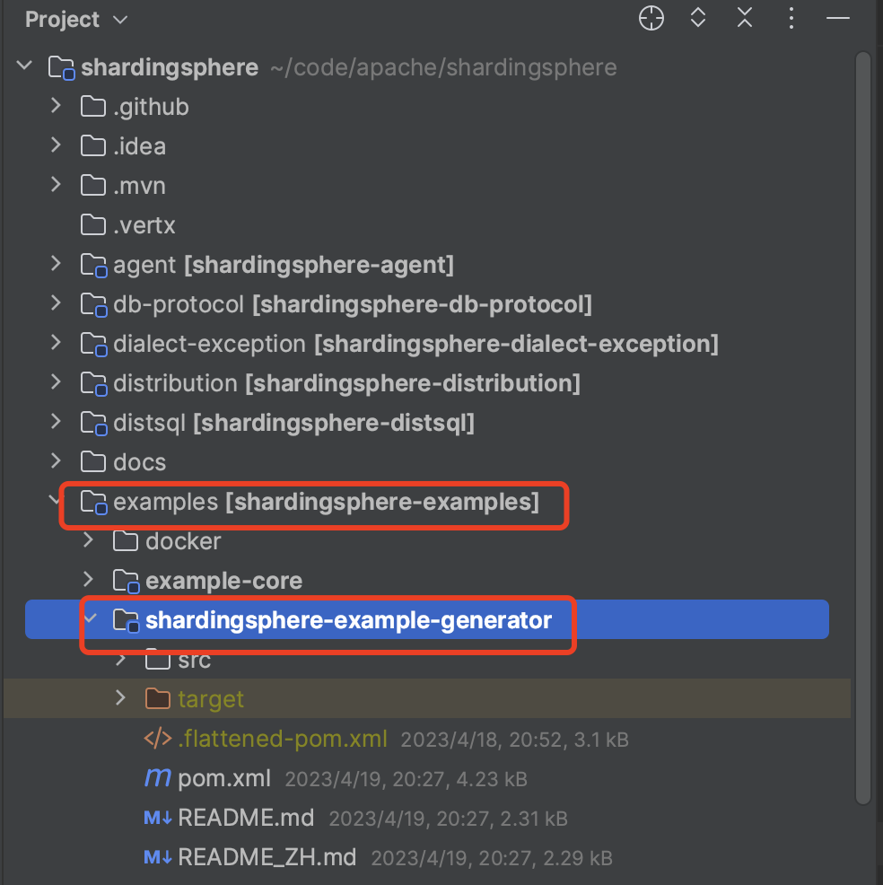 进入 ShardingSphere 项目目录,找到对应的 example 模块中的 shardingsphere-example-generator 模块,这个模块为示例生成模块,所有模版文件以及生成逻辑在这个模块中。2. 配置生成引擎的参数
