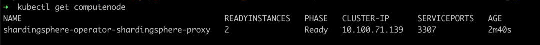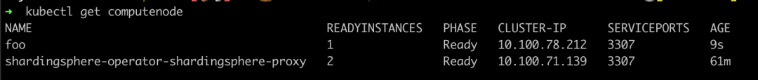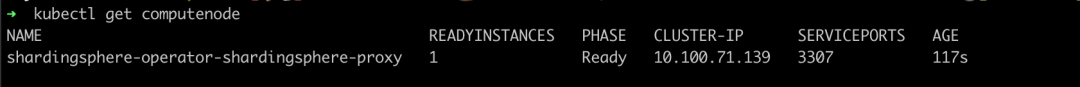 READYINSTANCES:表示当前处于 Ready 状态的 ShardingSphere Pod 数量,如图中为 1 PHASE:表示当前集群状态,如图中为 Ready 状态 CLUSTER-IP:表示当前集群 Service 的 ClusterIP SERVICEPORTS:表示当前集群 Service 的端口列表 AGE:表示当前集群的创建时长 kubectl get computenode