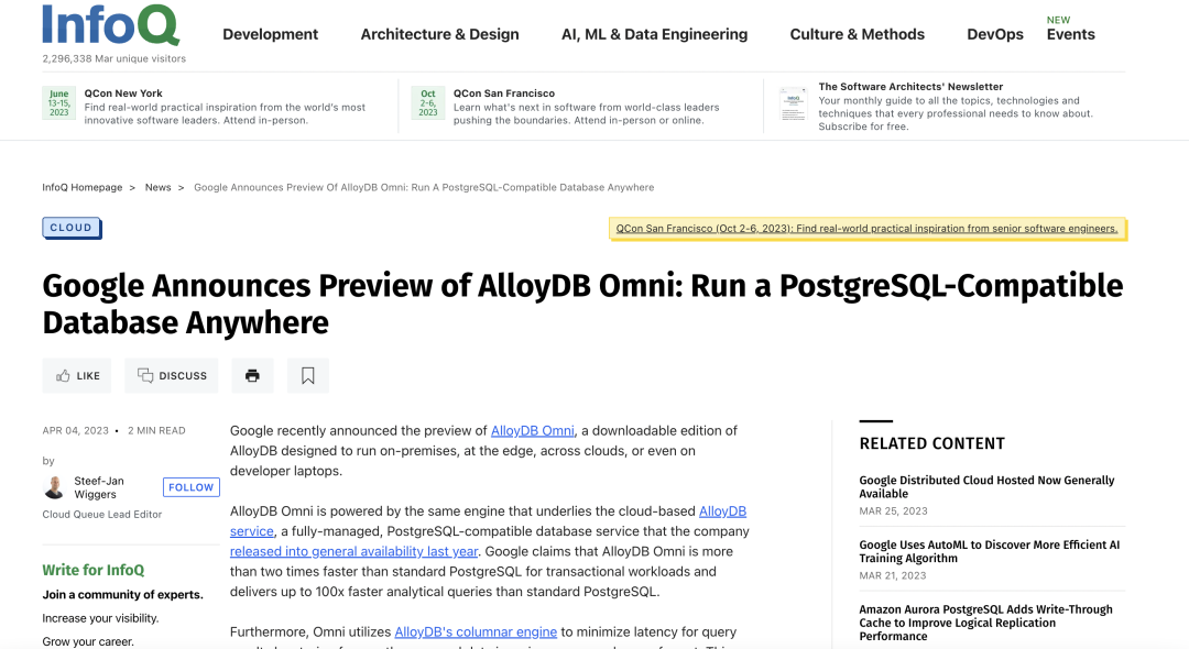 [Oracle Database] Oracle Database 23c Free 发布,Free 版本是一个面向开发者、全功能的、但资源使用受限 (2CPU/2GB RAM)、无 patch 的免费版本。[阿里云] RDS SQL Server 支持任务中心功能。任务中心功能与 2022 年 12 月上线,可以方便的从整体了解的 RDS 相关任务运行情况。[AWS] RDS Custom 版本支持了 GP3 存储。[Azure] Cosmos DB for MongoDB vCore 公测发布,新版本新增了更易理解的 vCore 计费模式。[Azure] 托管 PostgreSQL(Single Server 版)将于 3 年后下线,建议用户迁移到(Flexible Server 版)。[GCP] Datastream GA 支持 PostgreSQL 到 BigQuery 的同步;[GCP] 托管 MySQL、PostgreSQL、SQL Server 支持新的区域多哈(卡塔尔)。谷歌宣布推出