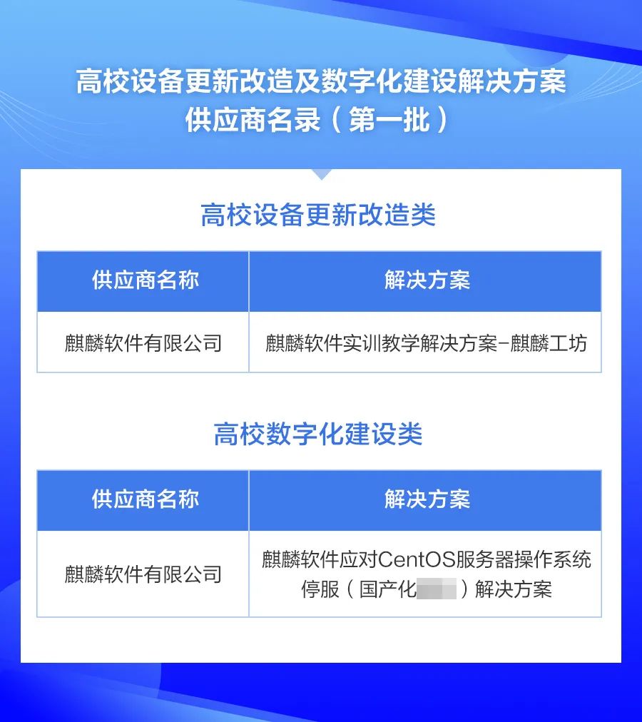 中国高等教育学会日前正式公布了“高校设备更新改造及数字化建设解决方案供应商名录(第一批)”名单,作为入选企业中唯一的国产操作系统企业,麒麟软件两大方案——麒麟工坊、CentOS停服应对解决方案成功入选。
