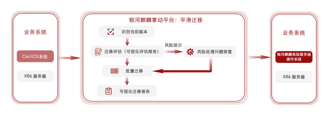 麒麟软件“CentOS停服应对解决方案”是根据用户不同需求,基于银河麒麟高级服务器操作系统和麒麟软件完善的技术服务能力,针对业务系统新增、扩容、不变三种场景制定不同的迁移方式,配合麒麟软件自研的迁移工具银河麒麟掌动系统管理平台的评估和迁移能力,降低用户业务系统适配国产架构平台难度,实现业务系统中服务器操作系统的迁移;此外,对目前不具备迁移条件的核心业务系统或老旧无人维护的业务系统,方案还提供CentOS安全接管服务,由麒麟软件提供安全接管服务支撑,保障现有CentOS系统安全稳定运行。用户可以根据自身业务系统情况和需求选择对应的迁移或安全接管服务。