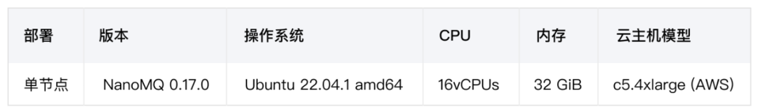 在本次基准测试中,NanoMQ 部署在一个单节点上。配置详情如下: