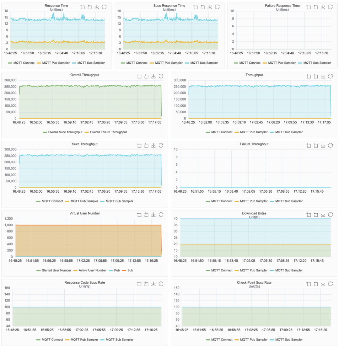 本次基准测试使用了 XMeter(https://www.emqx.com/zh/products/xmeter)作为测试工具,它模拟了所有的设备连接和消息吞吐量,分析数据并生成指标报告。以下是一些重点指标: