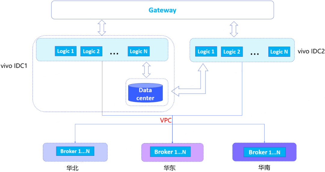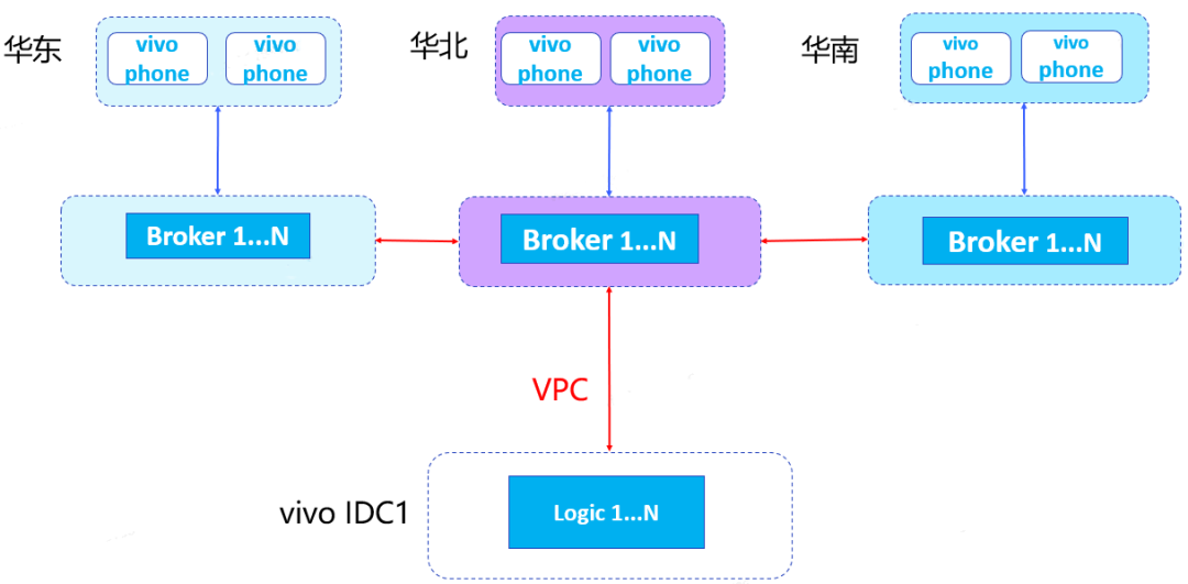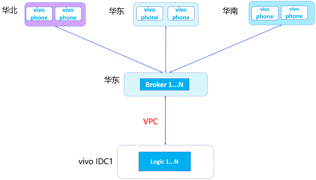 原有推送系统架构是长连接层都部署在华东,所有vivo IDC逻辑节点通过VPC与华东的Broker建立连接,手机端跟华东的broker进行长连接通信。这种部署方式存在以下问题。