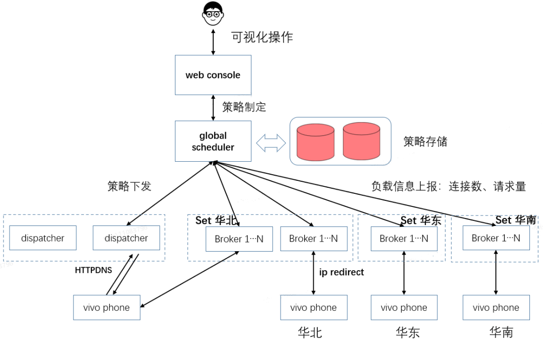 针对上述单个地区异常导致该区域部分设备无法收到推送消息的问题,我们设计了一套流量调度系统,可以做到实时流量调度和切换。global scheduler节点负责策略调度和管理。