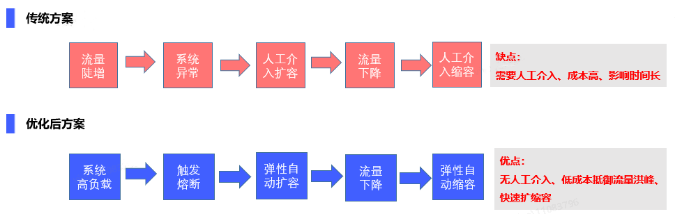常规的方案是一般是根据历史情况估算冗余部署大量机器,来应对突发流量。单这种方式成本较高,突发流量可能只持续5分钟或更短时间,而系统为了满足5分钟突发流量,需要冗余部署大量机器。一旦流量超过了部署机器可承担的上限,无法及时扩容,可能导致可用性下降,甚至出现雪崩效应。