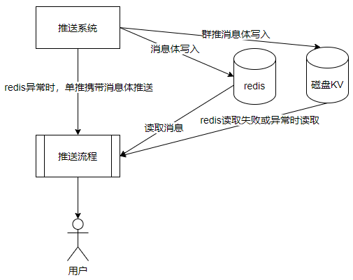 如果Redis集群故障,对于单推消息,推送系统可以携带消息体往下游推送,确保消息可以继续下发。对于群推消息,因为消息体冗余存储在磁盘KV中,当Redis集群故障后,可以降级到读取磁盘KV。
