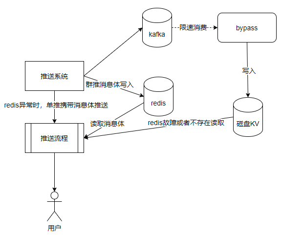 方案三还存在一个问题,就是磁盘KV的写入性能和Redis集群不是一个数量级,特别是时延,磁盘KV在平均在5ms左右。而Redis集群却在0.5ms。如果在推送系统对群推消息体进行双写。这个时延是不能接受的。因此只能采用异步写入磁盘KV的方式。这里将备份群推消息体,先写入消息中间件KAFKA,由bypass节点消费KAKFA进行异步写入磁盘KV。这样在使用的灾备磁盘KV资源较少的前提下,保证推送系统的高并发能力,同时可以保证群推消息体不丢失,Redis异常时,单推消息携带消息体推送,群推消息体读取磁盘KV。