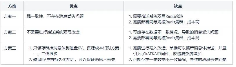 方案三:应用另一个分布式存储系统,磁盘KV,兼容Redis协议,同时具有持久化能力。可以保证消息体不丢失。但是为了节省成本,不再直接使用Redis集群对等资源。而是根据推送特点,推送分为单推、群推。单推是一对一推送,一个用户一条消息体。群推是一对多推送,一个消息体对应多个用户。群推往往是任务级别推送。因此我们使用一个相对小一些的磁盘KV集群,主要用于冗余存储,群推消息体,即任务级别的消息。对于单推,还是只保存到Redis中,不进行冗余存储。