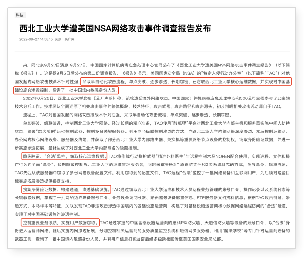 2022年9月5日,国家计算机病毒应急处理中心和360公司分别发布了关于西北工业大学遭受境外网络攻击的调查报告,中国教育基础设施安全的警钟被敲响。