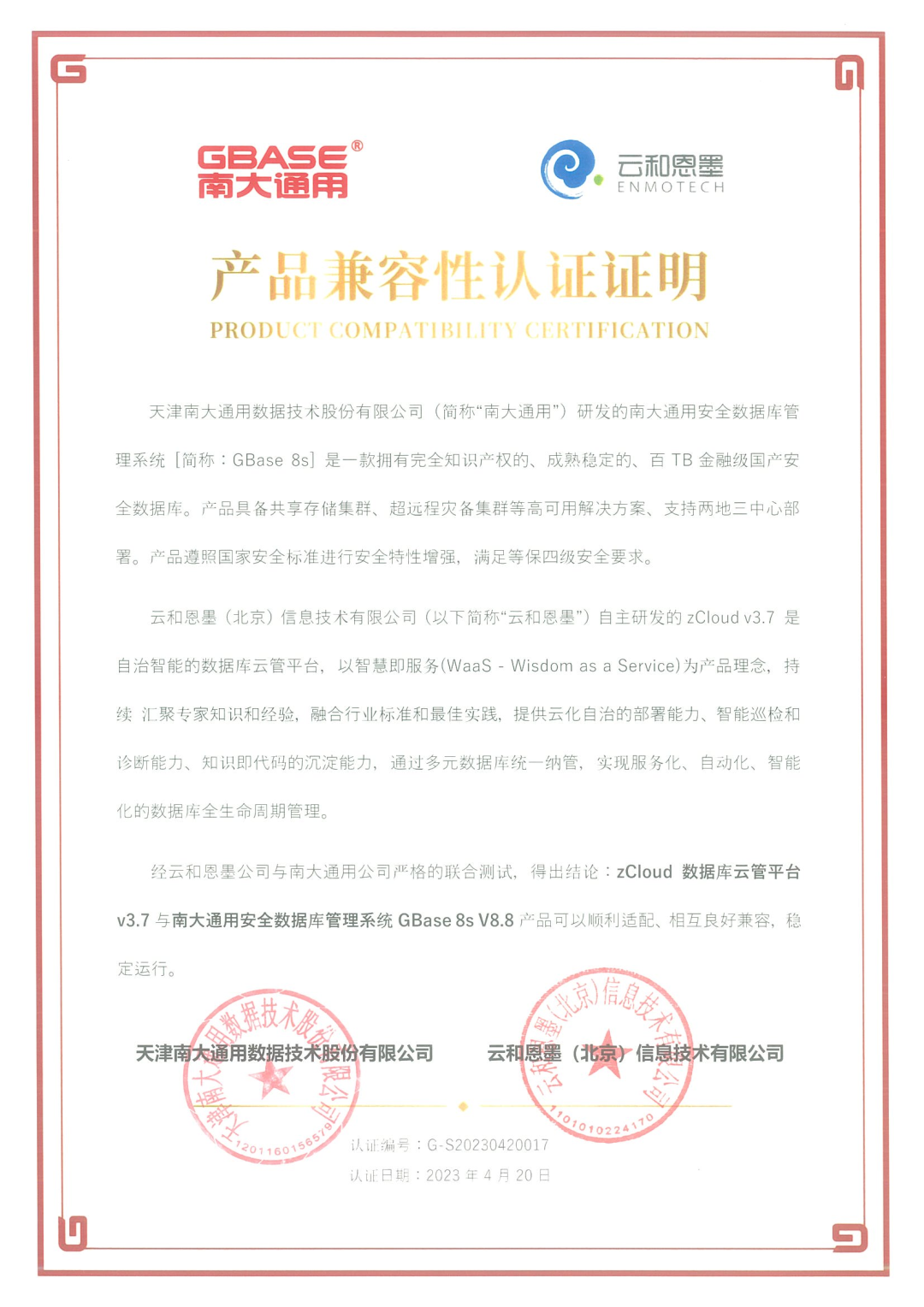 (zCloud 与 GBase 8s 兼容性认证证书)