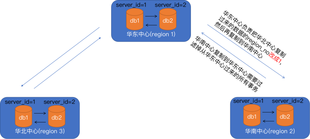 扩展到多中心后,DBMotion会做额外的处理。在华东中心把从华北中心复制过来的数据和业务所请求的数据统一标记成region1。那么,在华南中心复制过来的业务数据没有标记,而从华东中心复制过来的数据都有标记,就可以将打标的更新成功过滤。