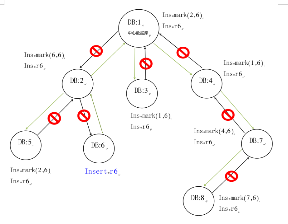 当然,这种同步还是避免不了用户故意搭建的环形复制链路产生循环复制,所以DBMotion支持的异地多活,目前只能支持树形复制,类似于下图的结构。在region-id=6的数据库上插入一笔数据,通过DBMotion同步到region-id=2的节点时,会将2标记为同步到region-id为1和5的节点,并且从1和5同步回来时会自动被过滤掉,之后会依次被同步到3,4;7;8。