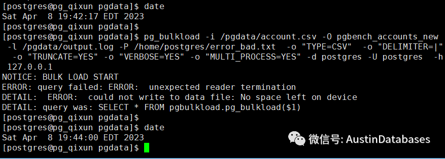 pg_bulkload -i /pgdata/account.csv -O pgbench_accounts_new -l /pgdata/output.log -P /home/postgres/error_bad.txt -o "TYPE=CSV" -o "DELIMITER=|" -d postgres -U postgres -h 127.0.0.1