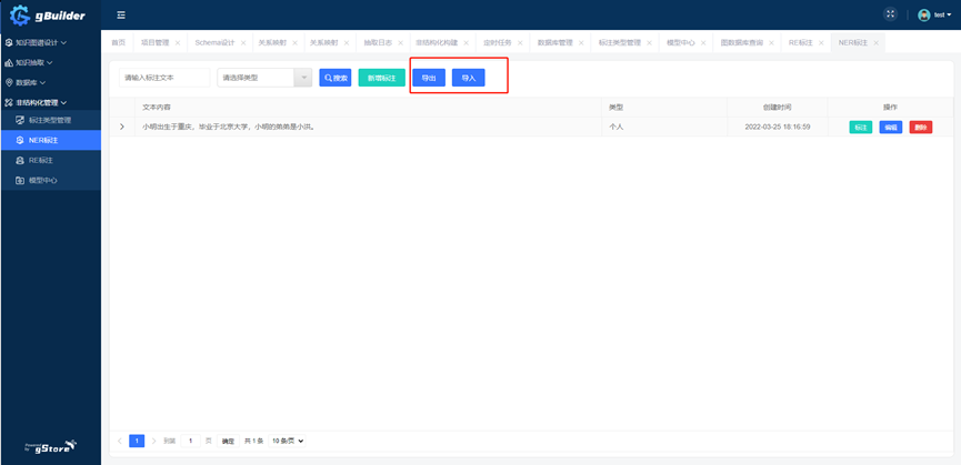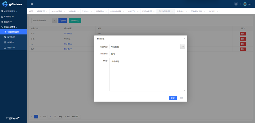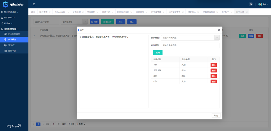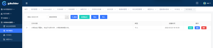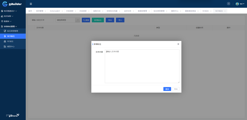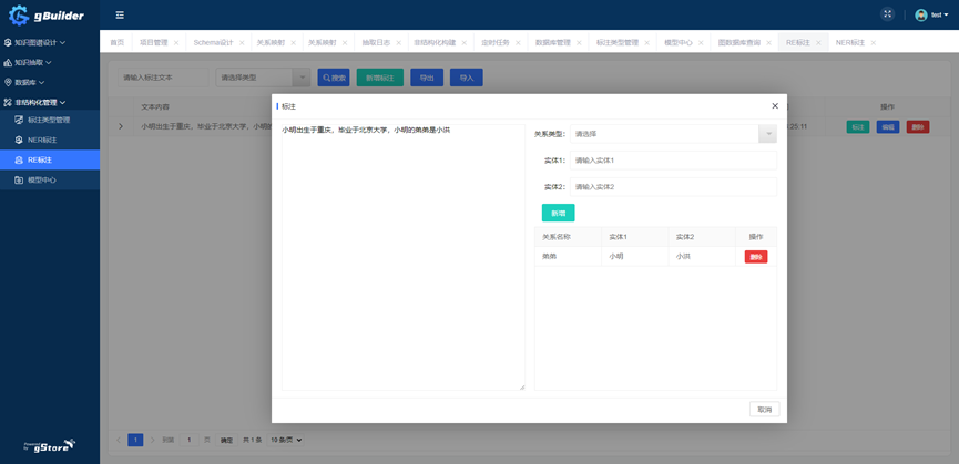 用户在本部分进行标签管理,用户可增加自己在后面实体抽取和关系抽取过程中需要的标签。