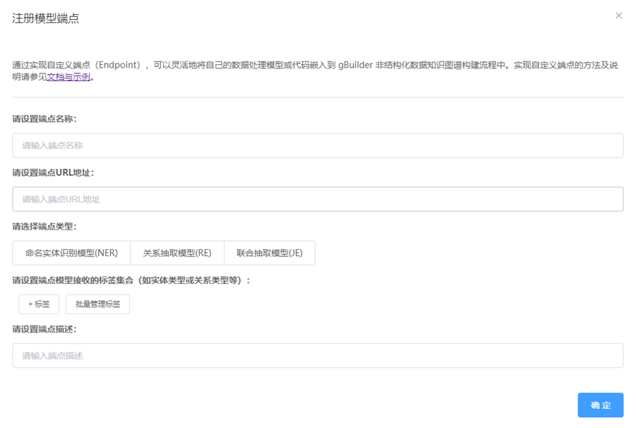 针对本身具有信息抽取能力的使用者,可通过自定义端点(Endpoint),可以灵活地将自己的数据处理模型或代码嵌入到 gBuilder 非结构化数据知识图谱构建流程中。从而高效、准确、快速的实现非结构化数据的抽取,实现自定义端点的方法及说明请参见文档与示例(https://github.com/pkumod/gbuilder-endpoint-example)。具体如下图所示: