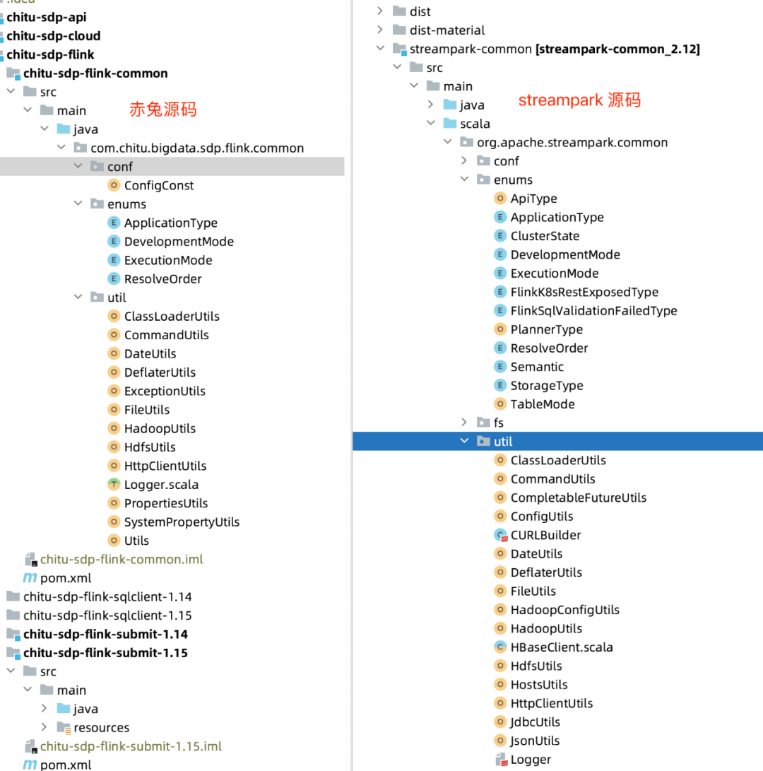在其 flink 模块中存在大量的 StreamPark 项目源码, 由于篇幅有限,这里只罗列部分内容的对比,我们先看 common模块, 可以看到目录结构如下: