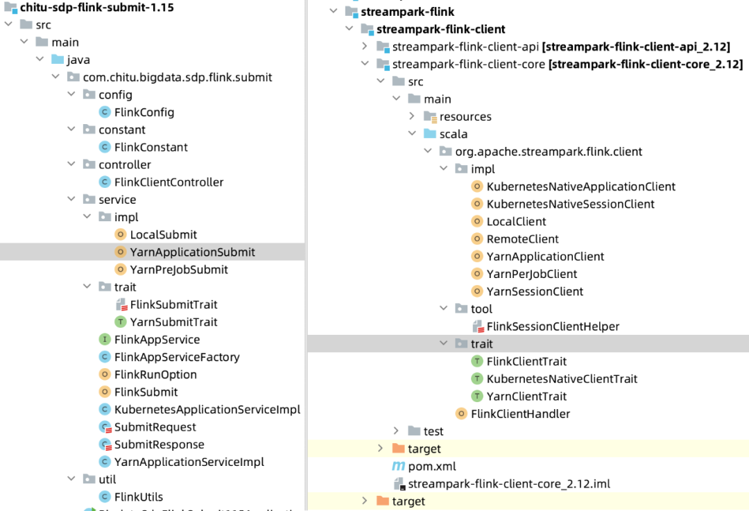 对比后发现整个 common 模块代码全部来自 StreamPark,只是更换了包名。接着我们看 flink-submit 模块 :
