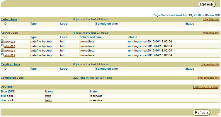 即使我们知道使用磁盘池做备份介质,这里备份设备类型也必须写sbt,这样才能保证rman能调用介质管理层的功能,后面的参数注意,testdp是我们在OSB中定义的设备,这个设备的定义里,指向一个备份服务器的本地文件系统(8块机械硬盘做的RAID 0)。