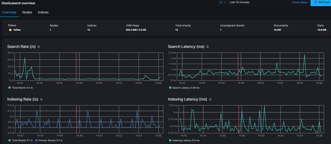 集群健康状况节点和分片:监控集群中节点的数量以及分片及其分布。 搜索性能:请求延迟和速率 - 跟踪搜索请求的延迟以及每秒搜索请求的数量。 索引性能:刷新时间和合并时间 - 监控刷新索引所需的时间以及合并段所需的时间。 节点利用率:线程池 - 监控每个节点上线程池的使用情况,例如索引池。