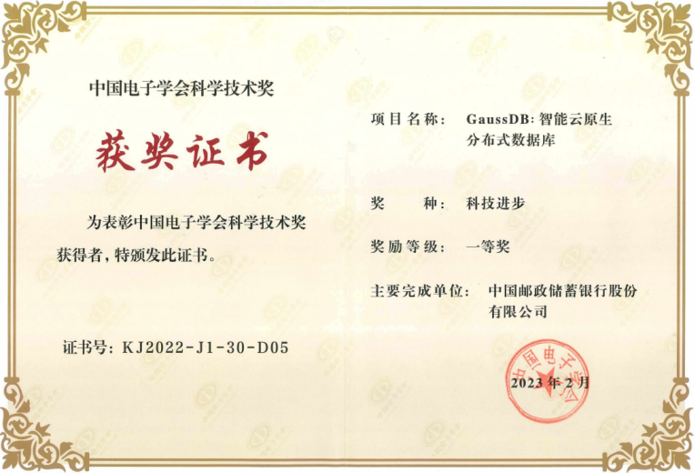 近日,在2022年中国电子学会科学技术奖的评选中,中国邮政储蓄银行凭借高斯数据库(GaussDB)在新一代个人业务核心系统的全面应用与深度联合创新,获中国电子学会科学技术奖科技进步一等奖。