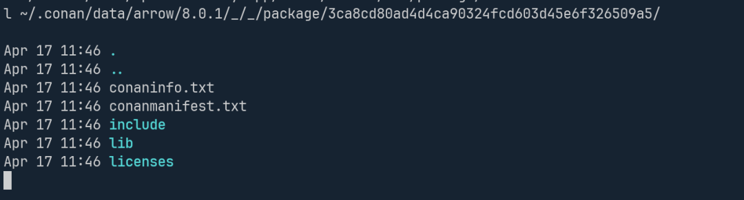 如果编译成功,会在 ~/.conan/data/arrow 下生成对应的包。