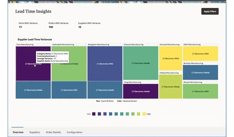 使用机器学习,基于实际性能显示差异,帮助客户提高提前期假设的准确性。该新功能内嵌于 Oracle Supply Chain Planning 的 Planning Advisor 中,可确定提前期趋势、异常及其潜在影响以及优先操作和推荐解决方案,从而提高计划效率,改善计划结果。