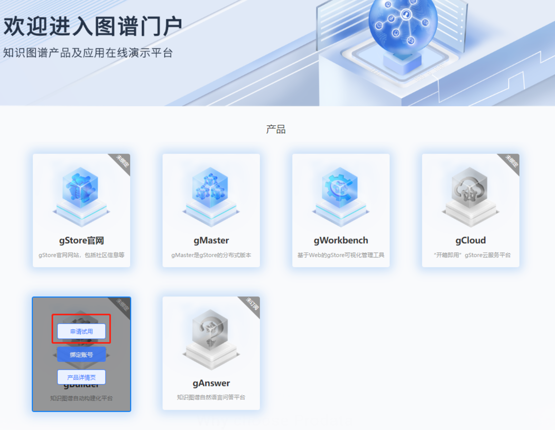 您可以登录图谱门户(点击阅读原文或访问 http://portal.gstore.cn),在产品中找到gBuilder,点击【申请试用】按钮,填写用途后点击提交,后台管理人员审核通过以后即可在线试用gBuilder。(近三月以来已申请试用正在等待审核的用户我们会统一审核,请及时关注图谱门户的产品试用审核状态)