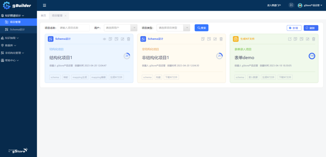 1、项目管理:以项目的形式来管理每个知识图谱构建任务,项目分为结构化项目、非结构化项目、表单录入项目,并可实时展示各项目流程情况,进行导入、导出、删除、编辑等操作。