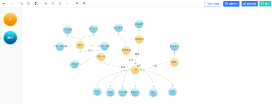 2、可视化Schema设计:知识图谱Schema可视化设计是gBuilder的特色功能之一,与protege不同,gBuilder的Schema设计采用的是以图的方式来表述知识图谱Schema,用户可以通过拖拽的方式在画布上设计类、类属性和关系。