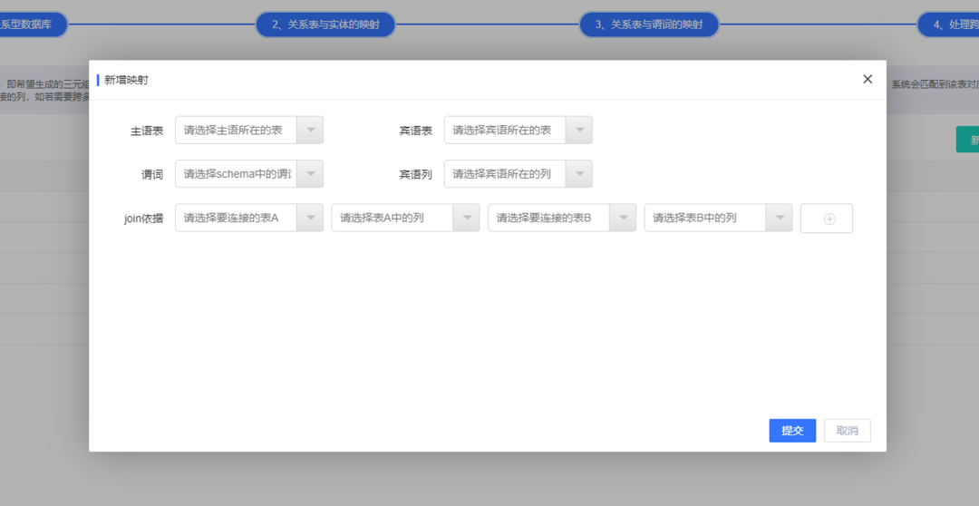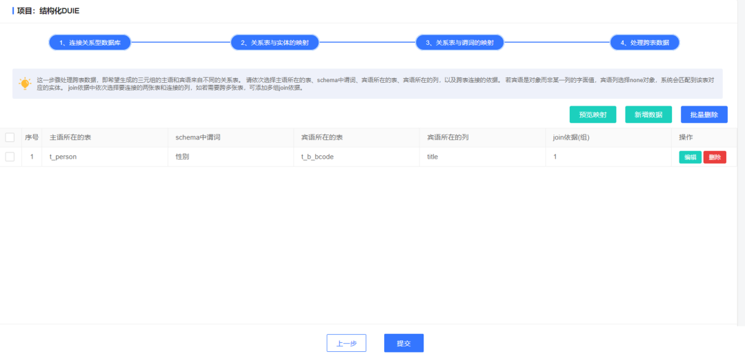3、结构化数据抽取:通过将表的字段自动化映射到Schema中,从而自动化构建知识图谱,主要包括获取数据库信息、表与实体映射、字段与属性、关系映射、跨表数据映射、生成mapping文件、D2RQ自动抽取等步骤。