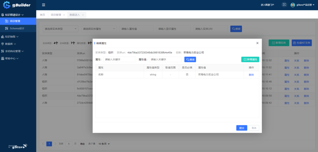 4、手动录入数据:根据schema自动生成表单,通过手动录入的方式来构建知识图谱数据。进一步降低了知识图谱构建的技术门槛。