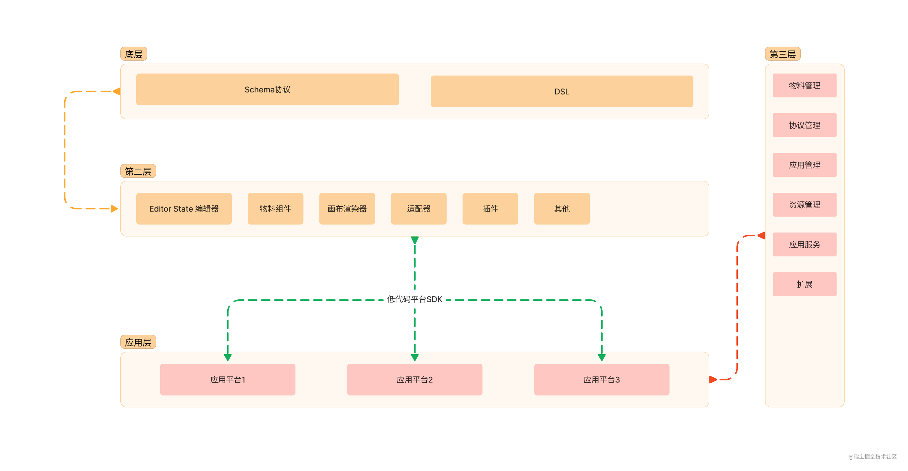 - 第二层是编辑器层,这一层主要实现了根据底层协议来装填物料、页面内容编排、画布预览区域的渲染器显示;