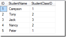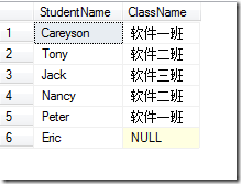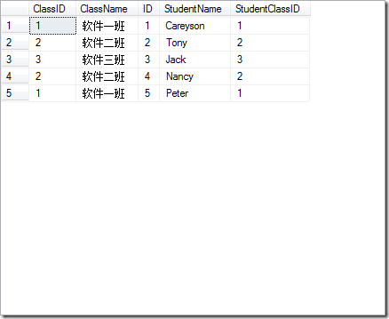 CREATE TABLE Student (ID INT,StudentName varchar(50),StudentClassID INT)--插入Student表数据INSERT INTO Student VALUES (1,'Careyson',1),(2,'Tony',2),(3,'Jack',3),(4,'Nancy',2),(5,'Peter',1)--查询表数据SELECT * FROM Student--创建Class数据表CREATE TABLE Class (ClassID INT,ClassName varchar(50))--插入Class表数据INSERT INTO Class VALUES (1,'软件一班'),(2,'软件二班'),(3,'软件三班')--查询表数据SELECT * FROM Class