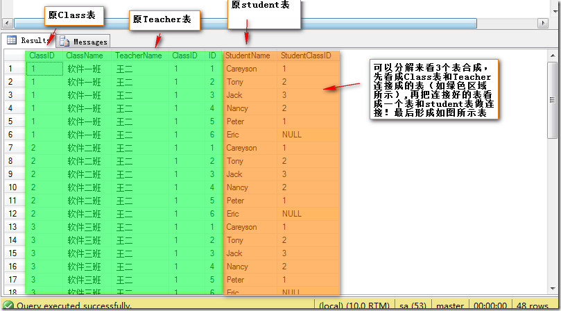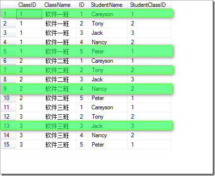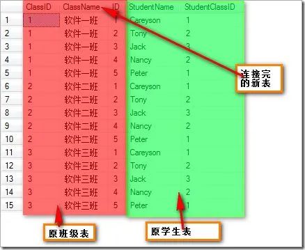 然后通过on后面的限制条件,只选择那些StudentClassID和ClassID相等的列(上图中划了绿色的部分),最终,得到选择后的表的子集