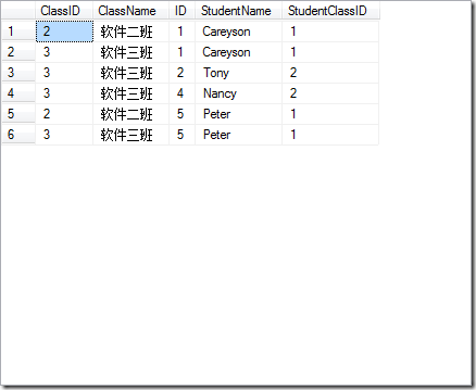 则结果从第一步的笛卡尔积中筛选出那些ClassID大于StudentClassID的子集: