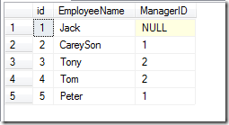 --创建Employee数据表CREATE TABLE Employee (ID INT,EmployeeName varchar(50),MangerID INT)--插入Employee表数据INSERT INTO Employee VALUES (1,'Jack',NULL),(2,'Careyson',1),(3,'Tony',2),(4,'Tom',2),(5,'Peter',1)--查询表数据SELECT * FROM Employee