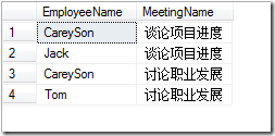--创建MeettingRecord数据表CREATE TABLE MeettingRecord (EmployeeName varchar(50),MeetingName varchar(50))--插入MeettingRecord表数据INSERT INTO MeettingRecord VALUES ('Careyson','谈论项目进度'),('Jack','谈论项目进度'),('Careyson','讨论职业发展'),('Tom','讨论职业发展')--查询MeettingRecord表数据SELECT * FROM MeettingRecord