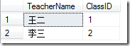--先删除之前添加的Student表中的第六条数据DELETE FROM Student WHERE ID =6--创建Teacher数据表CREATE TABLE Teacher (TeacherName varchar(50),ClassID INT)--插入Teacher表数据INSERT INTO Teacher VALUES ('王二',1),('李三',2)--查询Teacher表数据SELECT * FROM Teacher