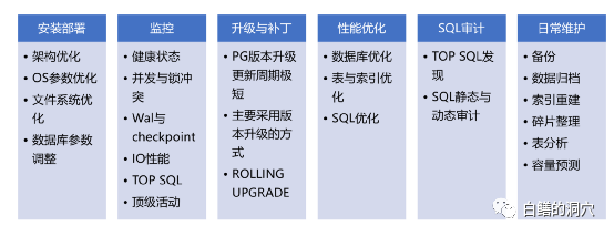 在PG数据库的运维中,从一个ORACLE DBA的角度,我也总结了一些日常运维与优化的工作内容。因为今天下午我还要赶到东莞去参加华为的鲲鹏昇腾开发者峰会,所以今早的事情比较多,我就不展开介绍了,如果大家有兴趣,明后天我会把上面这个片子详细地介绍一下。大家有兴趣的话,就在下面留言吧。