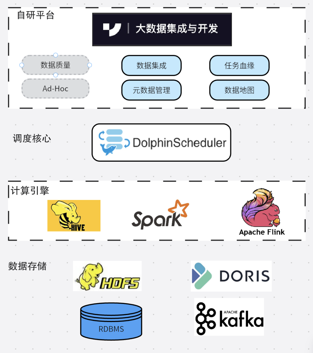 集度大数据集成平台日累计离线调度任务量2w+,既要满足高并发分发任务也要满足多种任务类型,为了保障数据的准确性和及时性,集度选择Apache DolphinScheduler作为核心调度系统,在此基础上也做了二次的开发,形成一整套体系,包含元数据管理、血缘地图、数据集成、数据质量管理、Ad-Hoc等,从而降低了使用数据的成本。