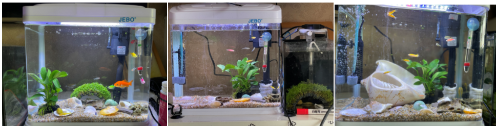第三阶段时间是最长的,配备了更大的鱼缸,也配置了更多的水草,加热棒,增氧器,后来也加了一个大海螺。养的鱼也从天使鱼,金鱼逐步过渡到了斑马鱼。