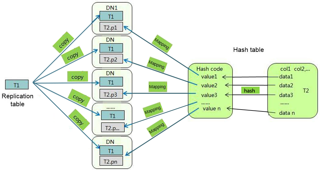 哈希(Hash)表将表中某一个或几个字段进行hash运算后,生成对应的hash值,根据DN实例与哈希值的映射关系获得该元组的目标存储位置。对于Hash分布表,在读/写数据时可以利用各个节点的IO资源,大大提升表的读/写速度。一般情况下大表定义为Hash表。