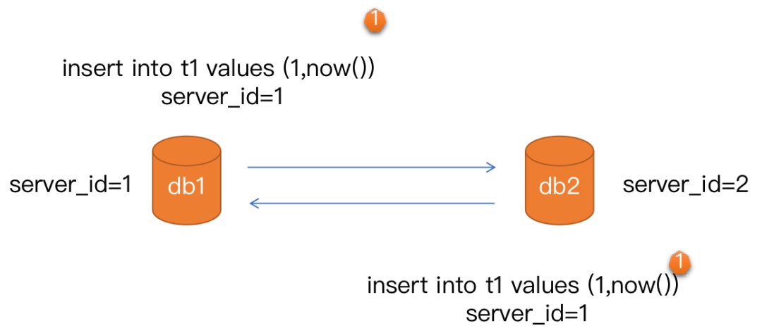 当然,通过MySQL基于server-id是可以避免的。如图,在db1插入的数据,插入到db2的时候,在日志中也记录为server-id=1。这样dbmotion的反向复制,检查到server-id为1的日志要同步回来,就可以安全的过滤掉。