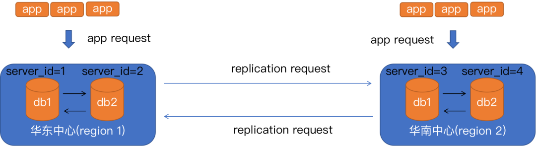 但是这种方式需要精准的控制每个中心所有数据库的server-id,下图中如果是server-id=1产生的更新,就会在华南中心的双master实例间做无限循环复制。