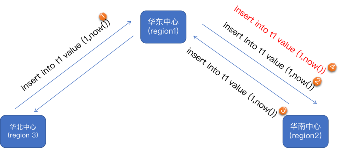 如果扩展到多中心,还是会存在循环复制的问题,如图:在华北中心插入的数据被标识为region3,复制到华东和华南中心时,他们发现数据都不是自己发出的时候,就会出现循环复制的问题。