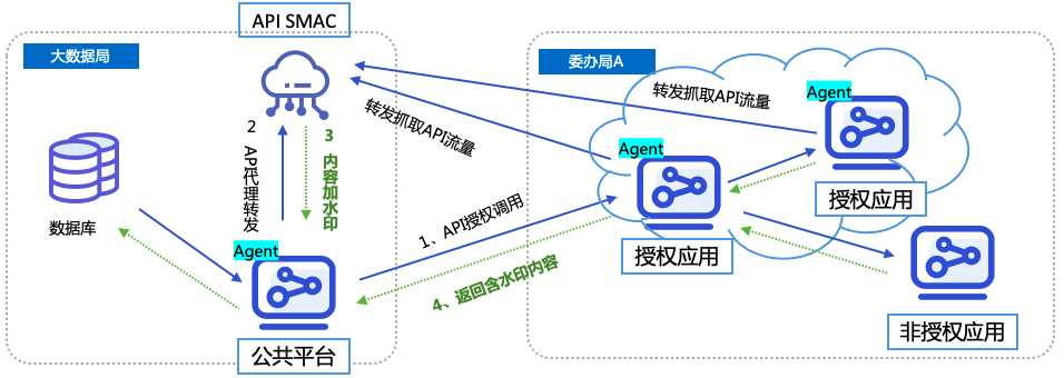 在大数据局侧部署API安全监测与访问控制系统(API-SMAC),通过在公共平台及授权应用部署探针抓取转发API流量,从而对API资产进行发现及梳理,实现数据流转过程中的安全监测和访问控制。同时,API安全监测与访问控制系统创新无痕水印技术,实现数据泄露溯源功能,数据泄露之后,实现从业务系统泄露的数据能够溯源到人,并提供原始日志作为证据。