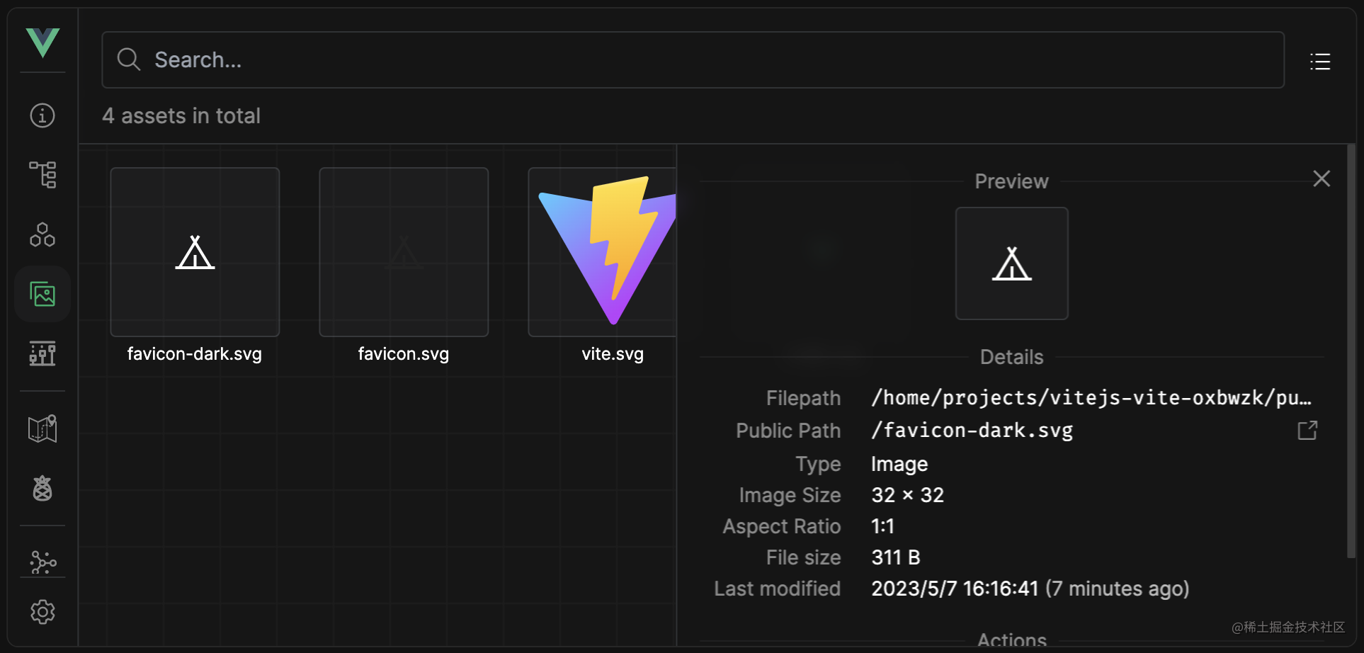 Assets Tab展示了你的静态资源列表(目前只展示 Vite config.publicDir 目录下资源)以及它们的详细信息,你可以在浏览器打开或下载它们。