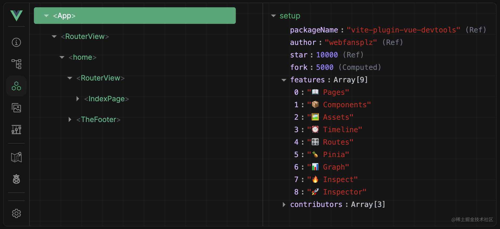 这个插件的灵感高度来自于Anthony Fu创作的nuxt/devtools,并且复用了它的UI及一些功能。